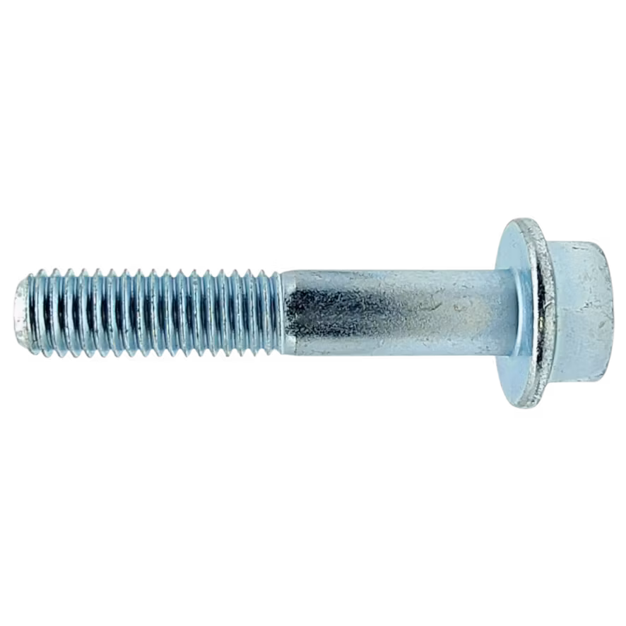 En blankförzinkad (FZB) sexkantskruv med slät fläns enligt EN 1665-standard.