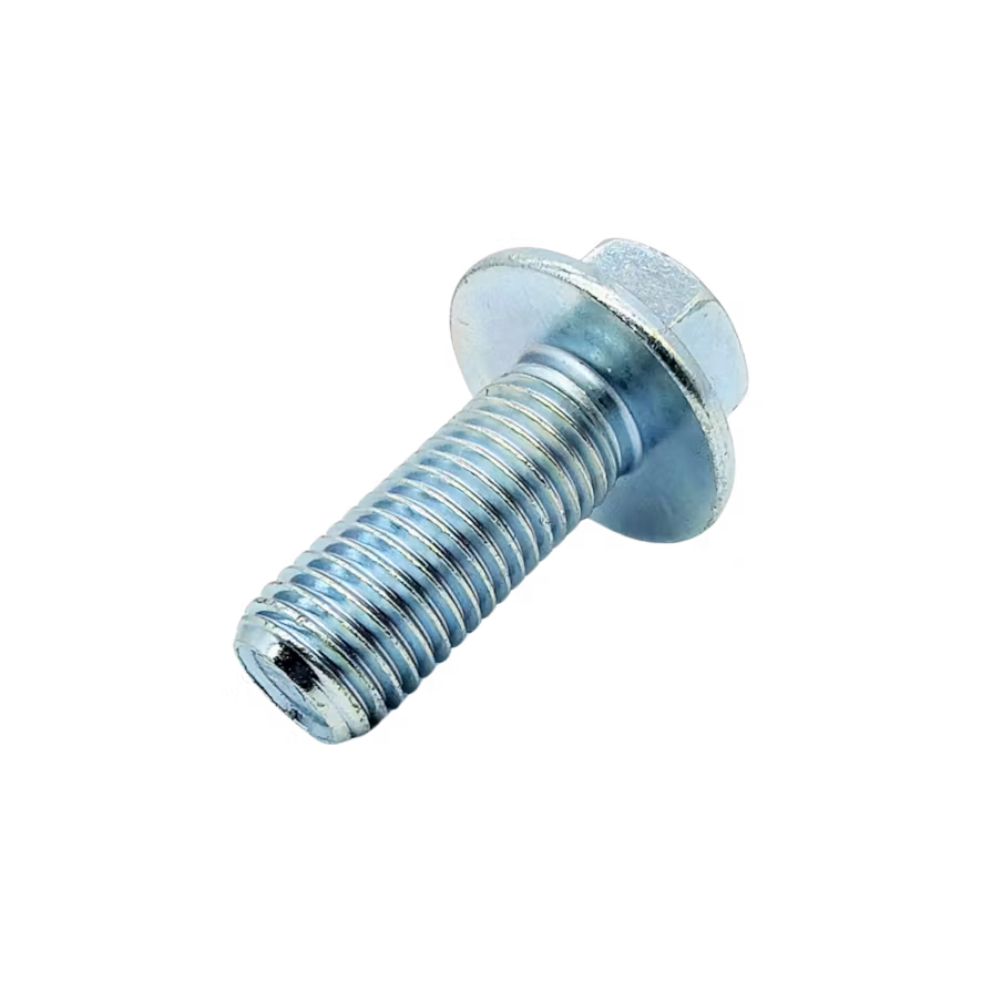 En blankförzinkad (FZB) sexkantskruv med slät fläns enligt EN 1665-standard.